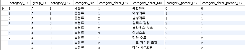 티몬이나 옥션 같은 쇼핑몰을 보면 트리형식으로 계층을 이루어 카테고리가 구성되어 있는 것을 볼 수 있다. 이를 구현하기 위해 만든 쿼리이다.
